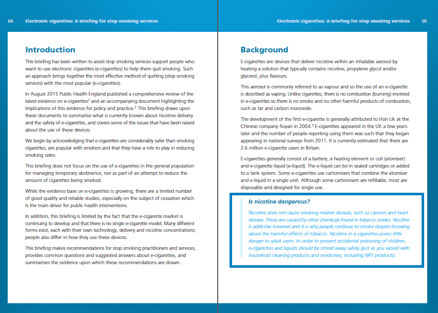 Alle domande frequenti poste dai pazienti (che spesso sono dubbi dello stesso specialista), come ad esempio “E’ pericolosa la nicotina? Con quale tipo di sigaretta elettronica dovrei iniziare? Posso fumare e svapare nello stesso tempo?”, gli esperti della Sanità Pubblica inglese rassicurano il personale del Centro Antifumo, con un linguaggio semplice e diretto, affinché sappia come gestire un percorso di disassuefazione dal tabagismo che prevede l’uso di e-cig.