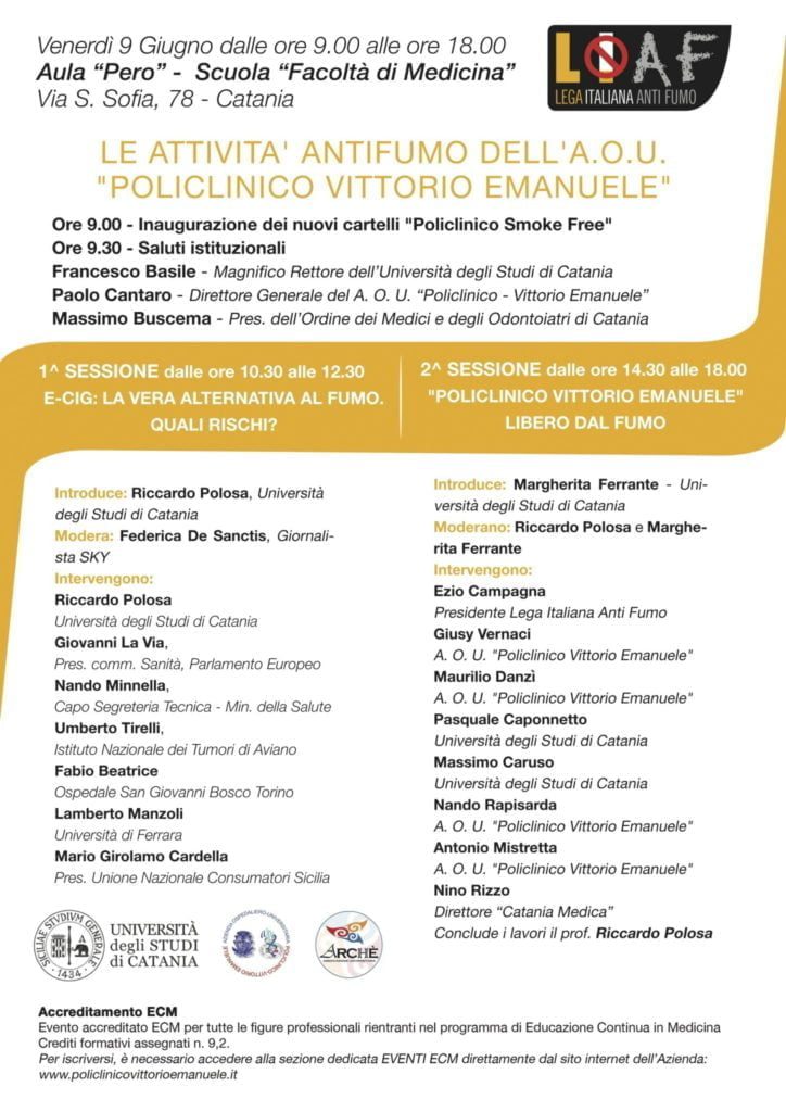 Catania 30/05/2017 – Saranno presentate il prossimo Venerdì 9 Giugno alle ore 9 nell’Aula “Pero” del “Policlinico – Vittorio Emanuele” tutte le nuove iniziative “smoke free” avviate dal “Policlinico – Vittorio Emanuele” grazie alla collaborazione con la Lega Italiana Anti Fumo – LIAF, l’Università degli Studi di Catania ed il Centro per la Prevenzione e Cura al Tabagismo (CPCT) dello stesso Policlinico.