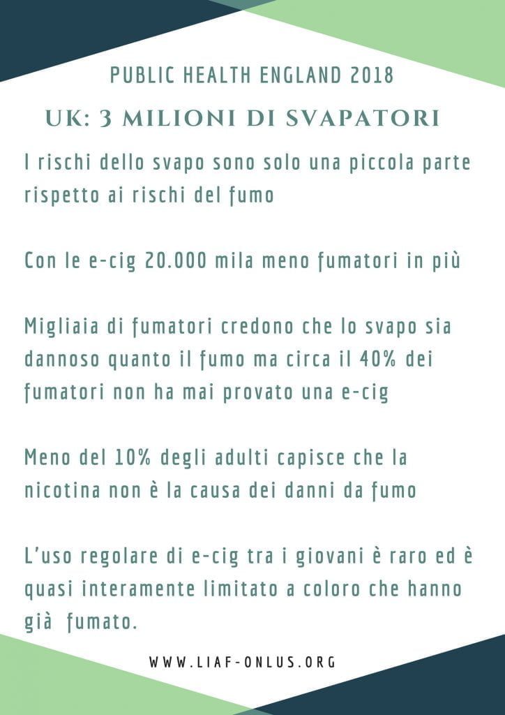 “Questa nostra nuova revisione consolida la visione positiva di PHE nei confronti dello svapo – ha affermato il prof. John Newton, direttore per il miglioramento della salute presso PHE – anche se purtroppo oltre la metà dei fumatori crede erroneamente che la e-cig sia dannosa quanto la “bionda”. Sarebbe tragico – ha continuato Newton – se migliaia di fumatori non iniziassero a svapare a causa di false convinzioni“.