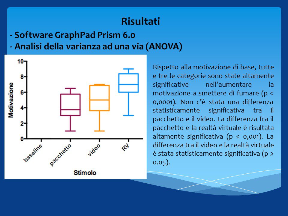 Sottoponendo un campione di fumatori alla visione di 3 stimoli ovvero un nuovo pachetto di sigarette con immagine shock,  un video antifumo e la realtà virtuale con immersione nei danni potenzialmente provocati dal fumo, il gruppo di lavoro ha riscontrato un aumento significativo della motivazione a smettere di fumare su tutti i soggetti sottoposti alle prove ma in particolare quando veniva utilizzato lo stimolo virtuale si è osservato il massimo livello motivazionale a smettere di fumare.