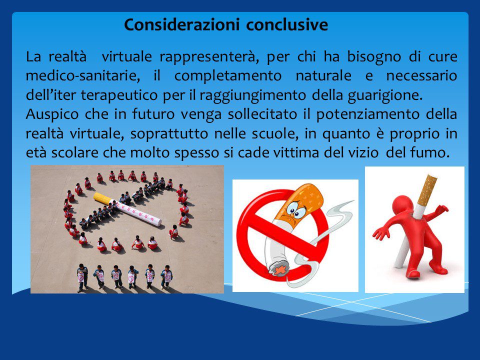 I vantaggi e le opportunità delle nuove tecnologie possono garantire sviluppi prima impensabili nel trattamento di alcune patologie. La realtà virtuale può essere usata nel trattamento dell?autismo, nella gestione del dolore, nella terapia d?esposizione e si spera in molte altre patologie ancora in osservazione ma intanto il lavoro di LIAF, Behaviour Labs e Centro Antifumo del Policlinico di Catania continua con l?obiettivo di rendere il nuovo software che motiva realisticamente i fumatori non motivati a smettere di fumare.