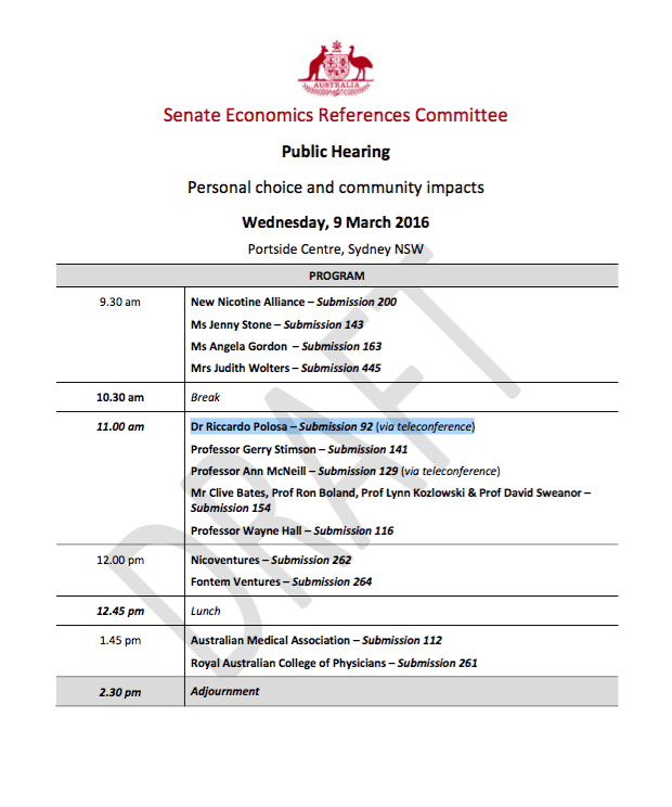 La convocazione ufficiale (vedi foto) è pervenuta anche al prof. Riccardo Polosa che, in un commento inviato lo scorso Agosto 2015, firmato dallo stesso docente di concerto con i membri della Lega Italiana Anti Fumo e altri esperti internazionali di tabagismo, aveva invitato il Senato australiano a lasciarsi guidare dalle evidenze scientifiche nell’adozione di misure razionali ed equilibrate capaci di favorire, e non ostacolare, la diffusione delle elettroniche come strumenti utili al miglioramento della salute pubblica.